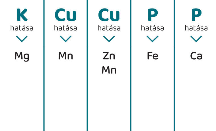 | Cu Réz | ligninképzés, pollen-képzés, enzimképzés, elektrontranszport | humuszban bő talaj, kilúgozott savanyú talaj, mészgazdag talaj | kalászosok | kékeszöld levél, levélsodródás, visszaszáradás, fonnyadás, léha kalász, anyarozs gyakori |