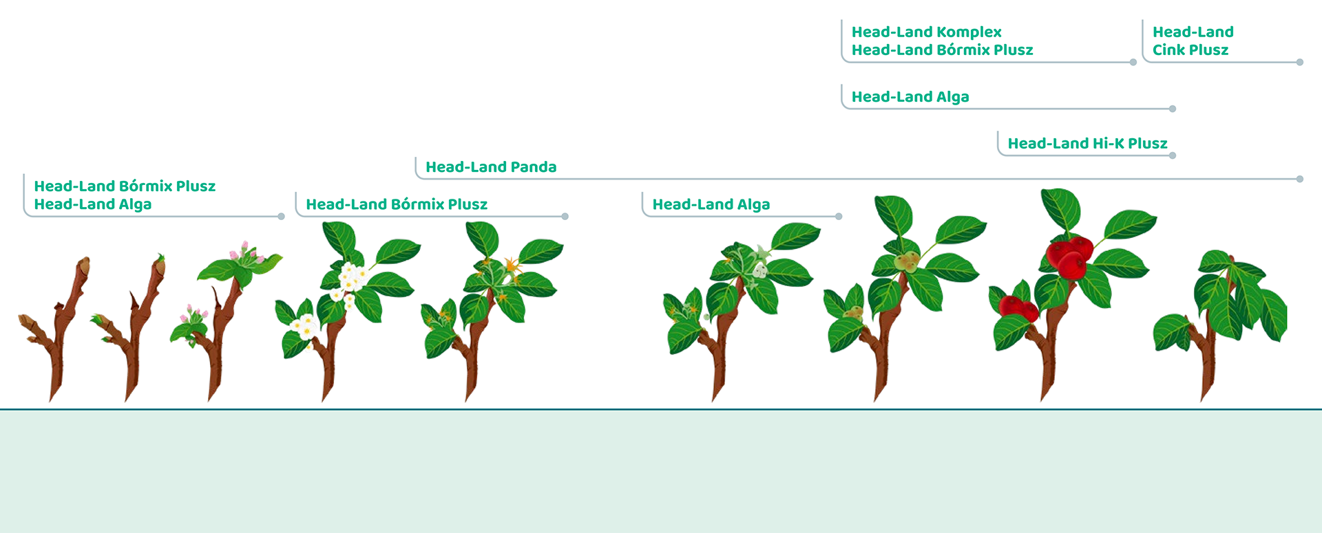 | rügyfeltöltés | Head-Land Komplex (2-3 kg/ha) | Head-Land Bórmix Plusz (1 l/ha) | Head-Land Cink Plusz (1 l/ha) |