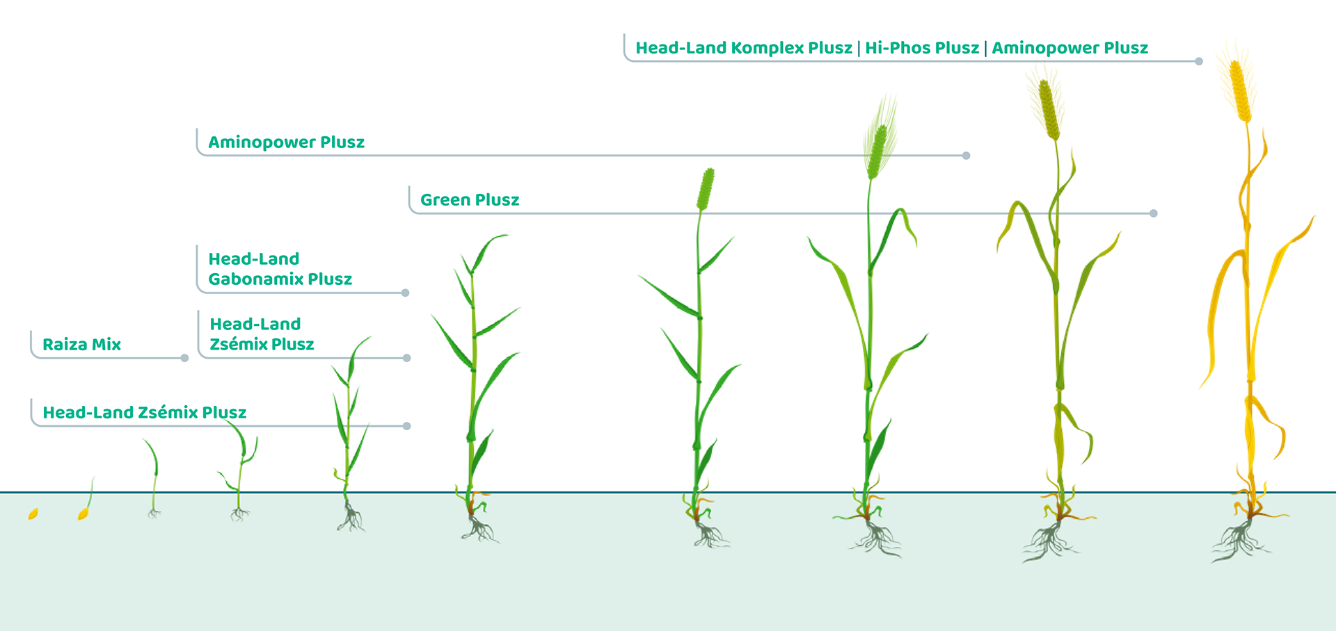 | gyökértömeg növelése | Head-Land Zsémix Plusz (1-3 l/ha) | Aminopower Plusz (0,5-1,0 l/ha) |